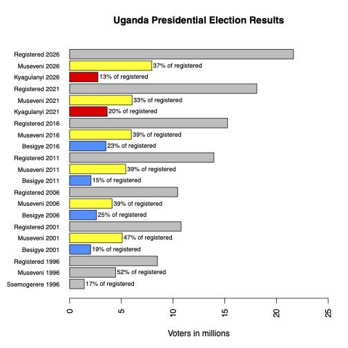 One thing is certain. This 71 percent, which sounds like an overwhelming win, does not represent a broad mandate. Just over a third of the electorate voted for the president in this, his seventh contest since taking power. However, this is not unique to the 2026 election. Since coming to power, President Museveni has only received a majority of the share of registered voters once – in 1996.
