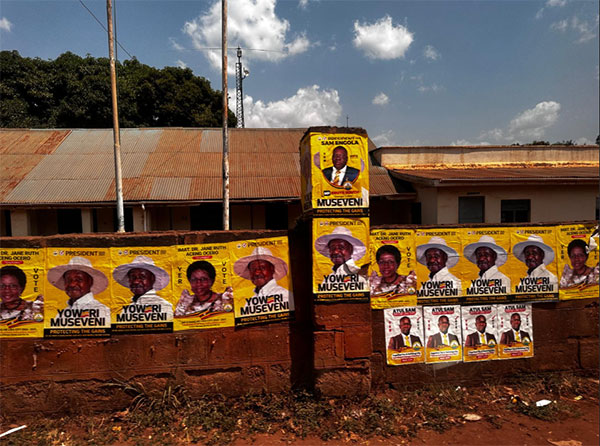 Election posters line a wall in Lira town last month